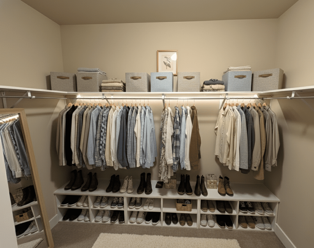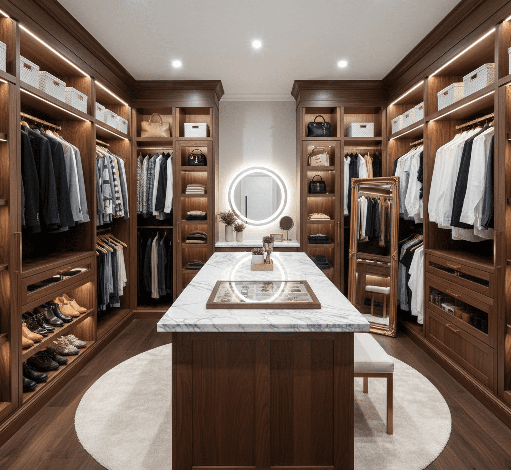 - Specialized Storage Features: Think velvet-lined jewelry drawers, pull-out valet rods, custom shoe walls, and integrated LED lighting.