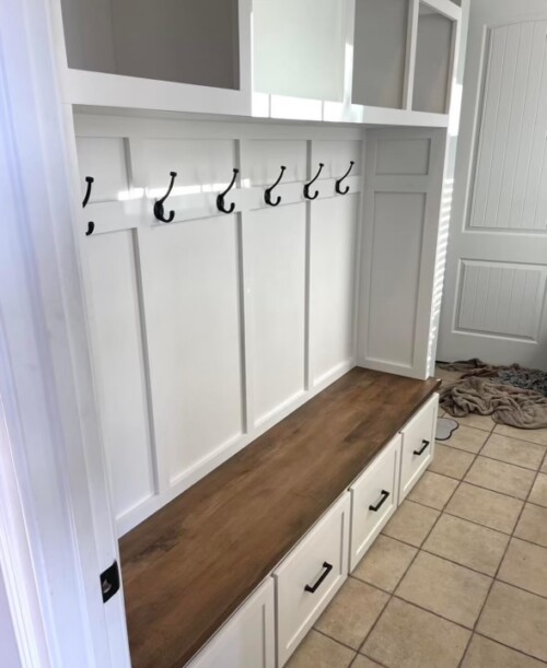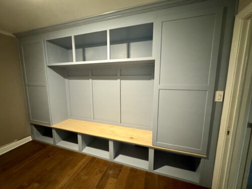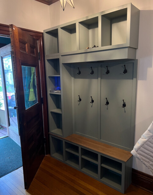 In addition to hall trees, we specialize in designing custom mudrooms and laundry rooms. We provide built-in cabinetry, cubbies for shoes, and shelves for additional storage. These spaces are designed to handle everyday wear and tear while keeping your home neat and tidy. Full-service delivery and Installation available by experienced trim carpenters.